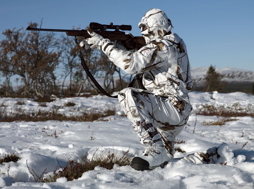Mossy Oak Winter ® Wykonane specjalnie dla myśliwych polujących zimą. Oparty na wzorach tła zimowego z elementami lasu typowymi dla tej pory. Podczas obserwacjo kamuflaży zimowych w otoczeniu stwierdzono że kamuflaże jednolicie białe nie zawsze dobrze maskują pionową sylwetkę myśliwego. Wynika to z innego konta padania światła na sylwetkę myśliwego i na płaszczyznę terenu. Dla tego kamuflaże Mossy Oak Winter znacznie lepiej ukrywają myśliwego w otoczeniu zimą niż te jednolite, natomiast w zimowym, leśnym pejzażu są praktycznie nie widoczne. |