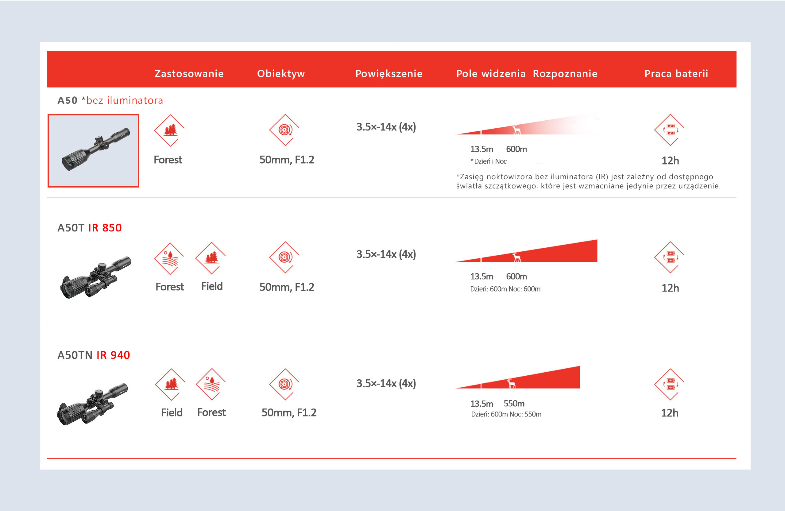 W modelu Alpex A50 obiektyw ma średnicę 50mm oraz powiększenie optyczne 3.5x przekładające się na pole widzenia 7.7° × 5.8°.