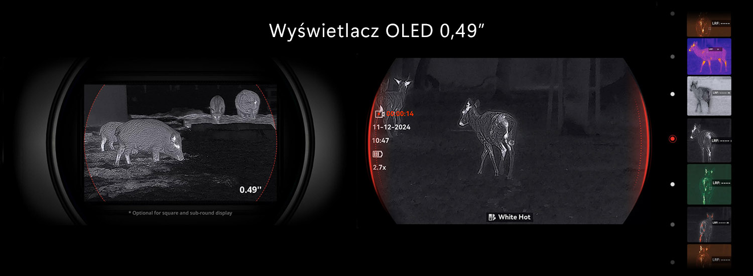 Wyświetlacz OLED 0,49", poprawa immersji o 25% Większy ekran o wyższej rozdzielczości zapewnia lepsze odwzorowanie kolorów i wyraźniejsze szczegóły. Dzięki o 25% większemu rozmiarowi i ekranowi OLED Full-HD 1920x1080, FALCON 2.0 prezentuje bogate detale zarówno zwierzyny, jak i tła, oferując bardziej immersyjne doświadczenie. Myśliwi mogą również dostosować kształt wyświetlacza z kwadratowego na zaokrąglony, zgodnie z własnymi preferencjami.