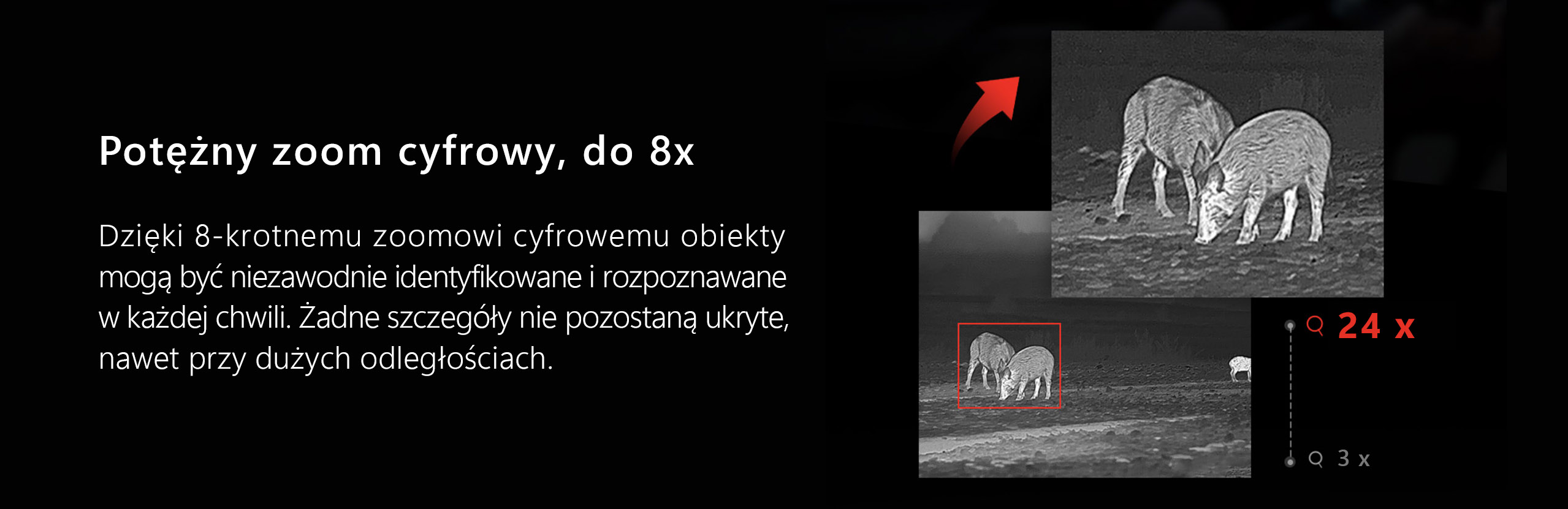 Urządzenie zostało wyposażone w stałe powiększenie optyczne 3,03x, które w połączeniu z aż 8-krotnym zoomem cyfrowym gwarantuje nam możliwość precyzyjnej identyfikacji celu na dużych dystansach. Cztery stopnie powiększenia pozwolą nam na idealne dostosowanie do dystansu dzielącego nas od zwierzyny. Do naszej dyspozycji oddane zostały cztery palety kolorystyczne wyświetlanego obrazu, dzięki czemu możemy dostosować go do naszych preferencji. Pierścień regulacji ogniskowania pozwoli nam natomiast na idealne dopasowanie ostrości obrazu do dystansów.