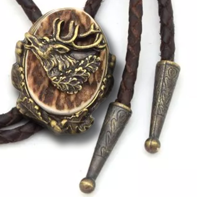 Krawatnik myśliwski wykonany ręcznie z motywem zwierzyny łownej  z mosiądzu,umieszczonym na fragmencie rogu jelenia byka  zawieszonym na eleganckim plecionym, skórzanym rzemieniu. Elegancko prezentuje się na koszuli myśliwskiej  zamiast krawata.