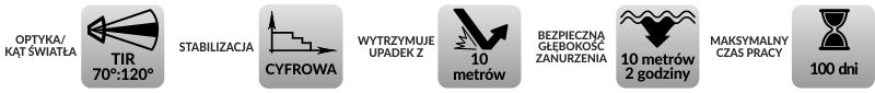 • Pełna ochrona przed wodą, brudem i kurzem zgodnie ze standardem IP68 — latarka działa dalej nawet na głębokości 10 metrów. Wytrzymuje upadki z wysokości do 10 metrów.