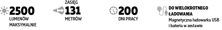 | Czas pracy | Tryb maksymalny - 2 godz. 40 min (650 lm po 30 sek.) Tryb minimalny - 200 dni |