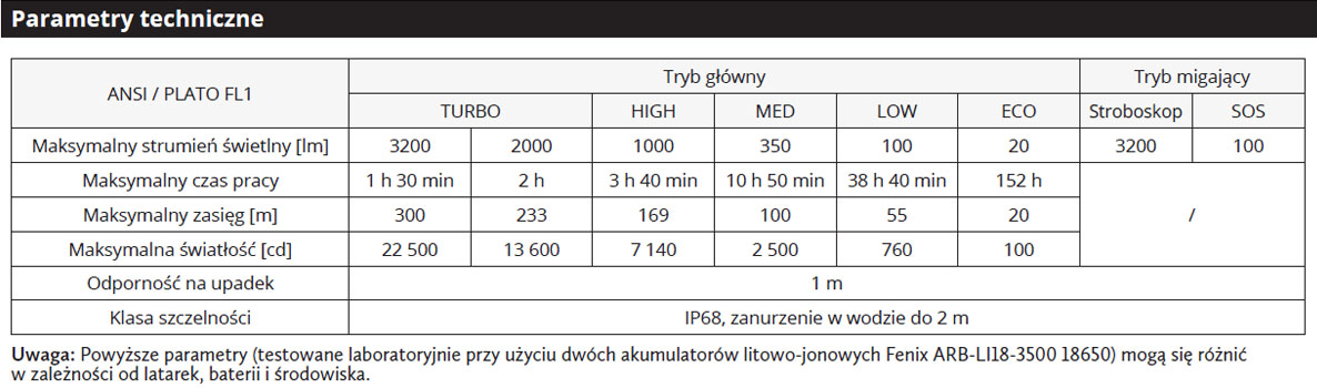 Swoje niezwykłe parametry świecenia, Fenix TK35UE 2018 zawdzięcza zastosowaniu potężnej diody XHP70 (Xtreme High Power), o rozmiarze aż 7 x 7 mm. XHP70 zapewnia szeroki kąt widzenia 120º, do 58% większą gęstość mocy ( w stosunku do innych emiterów o podobnej wielkości ) oraz o blisko 40% mniejsze zużycie prądu. Zwiększenie wydajności i sprawności, pozwoliło na uzyskanie maksymalnego strumienia światła aż 3200 lumenów (światłość 22500 kandeli) o zasięgu 300 metrów!