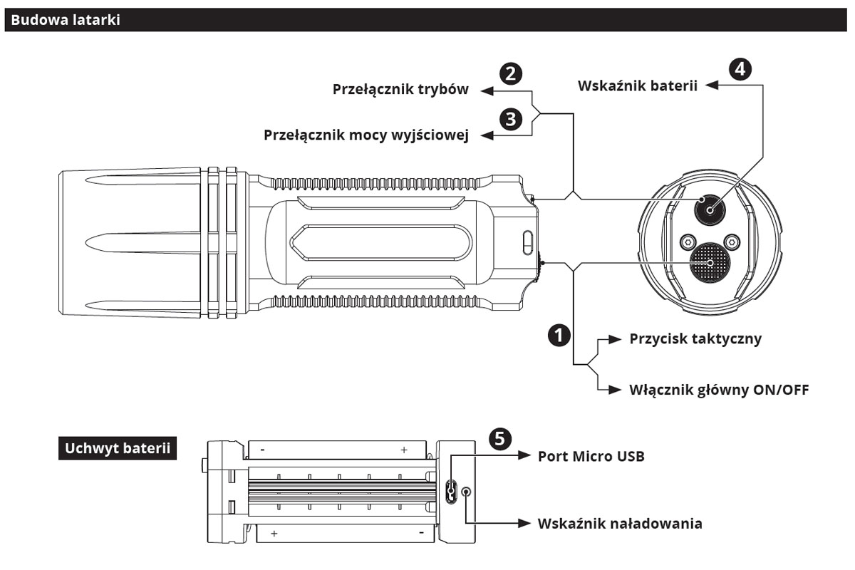 Latarka zasilana jest za pośrednictwem dwóch akumulatorów 18650, montowanych w specjalnym adapterze, który po wysunięciu pełni również rolę ładowarki. Zintegrowany port Micro USB umożliwia ładowanie akumulatorów bez konieczności zakupu standardowej ładowarki. W tym celu wystarczy jedynie znajdujący się w zestawie kabel USB oraz zewnętrzne źródło prądu np. power bank. Diodowy wskaźnik sygnalizuje ładowanie (kolor czerwony) oraz pełne naładowanie akumulatora (kolor czerwony).