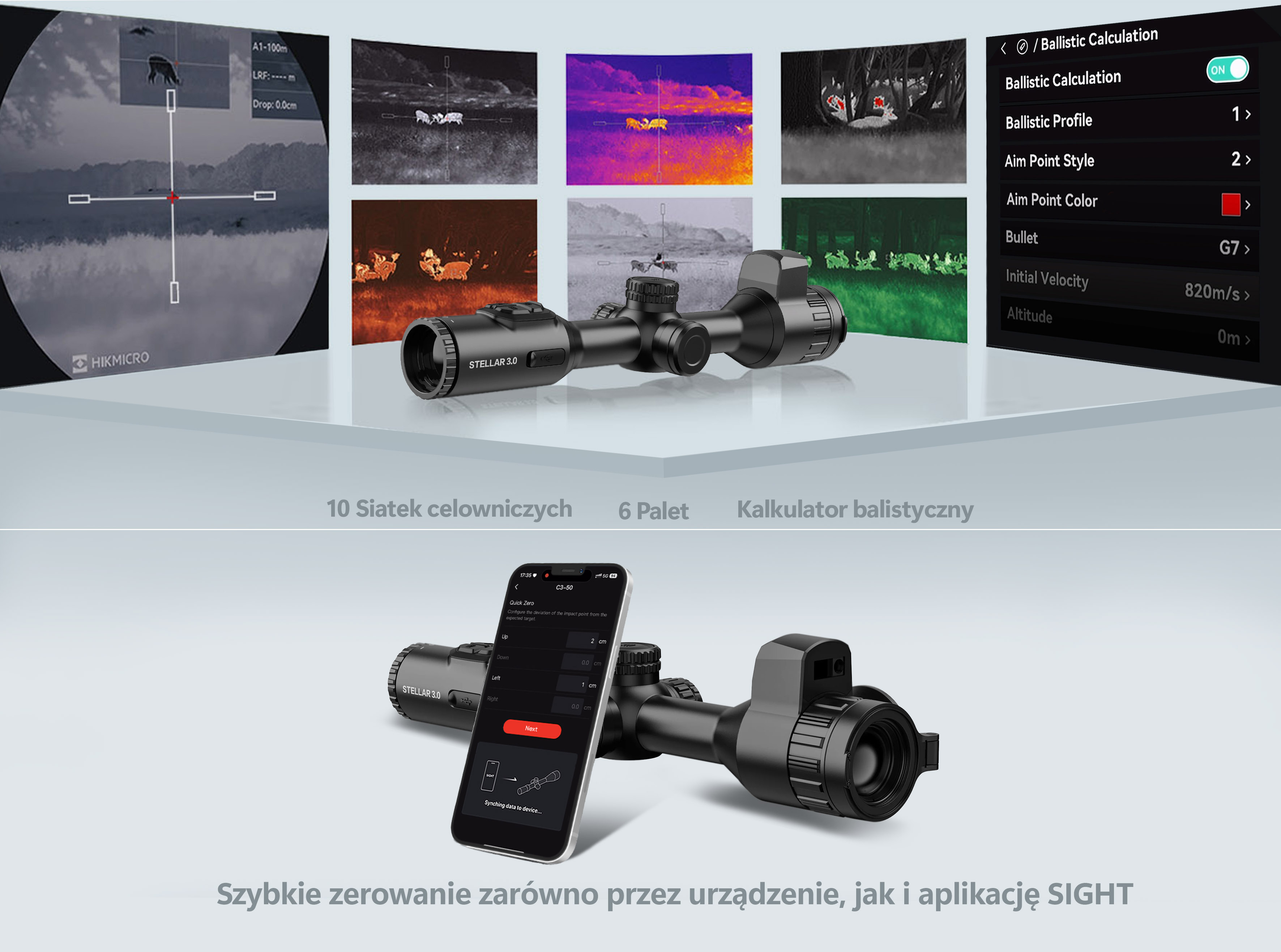 Kalkulator balistyczny w HIKMICRO STELLAR 3.0 zapewniają dokładne strzelanie na dowolną odległość. Nowy system obliczeń balistycznych przeprowadza automatyczną analizę kąta nachylenia i umożliwia dostosowanie koloru oraz stylu sugerowanego punktu trafienia, a także wybór typu pocisku, co zapewnia bardziej trafne decyzje podczas polowań na duże odległości.