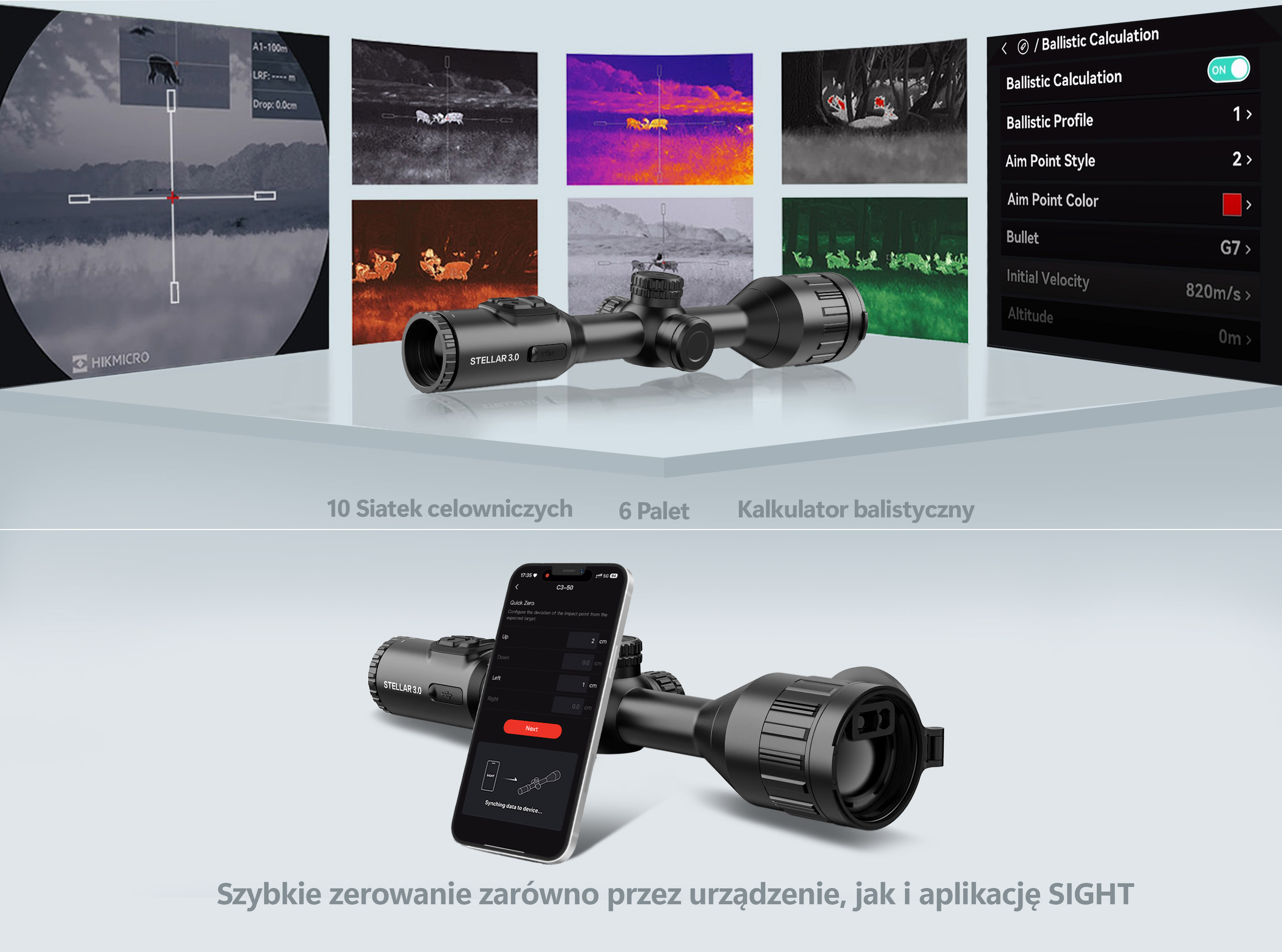 Oprócz zdalnego sterowania, przeglądania i pobierania, udostępniania niezapomnianych chwil oraz aktualizacji oprogramowania, aplikacja HIKMICRO SIGHT pomaga także w szybkim zerowaniu lunety STELLAR 3.0. Wystarczy skonfigurować odchylenie punktu trafienia od oczekiwanego celu za pomocą aplikacji Sight i zsynchronizować z lunetą.
