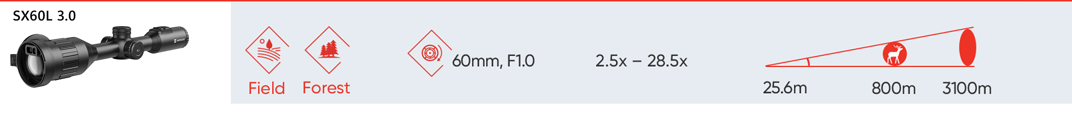 W celowniku termowizyjnym Stellar 3.0 SX60L obiektyw ma średnicę 60mm oraz powiększenie 2.5x-28.5x przekładające się na pole widzenia 14.6° × 11.7°. Celownik termowizyjny Stellar 3.0 SX60L dzięki odświeżaniu na poziomie 25Hz zapewnia płynny obraz nawet przy użyciu maksymalnego powiększenia cyfrowego
