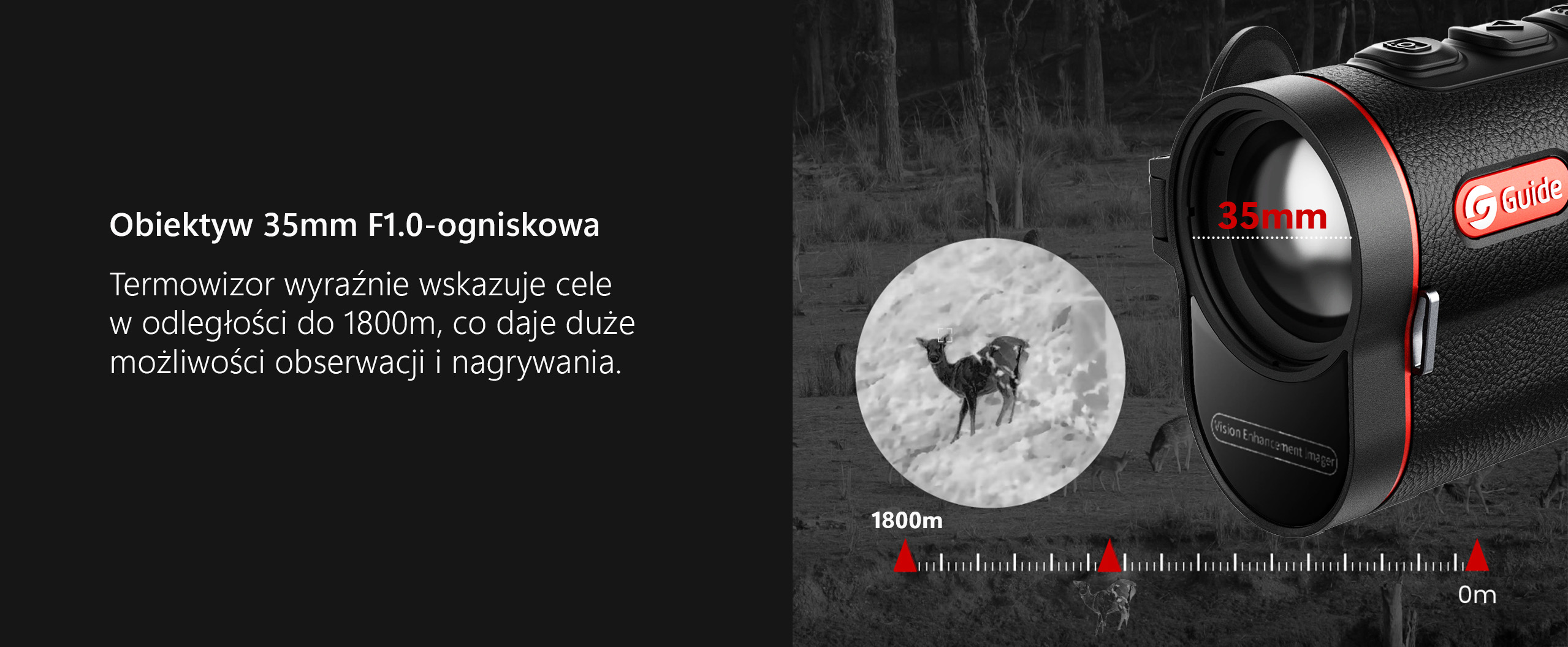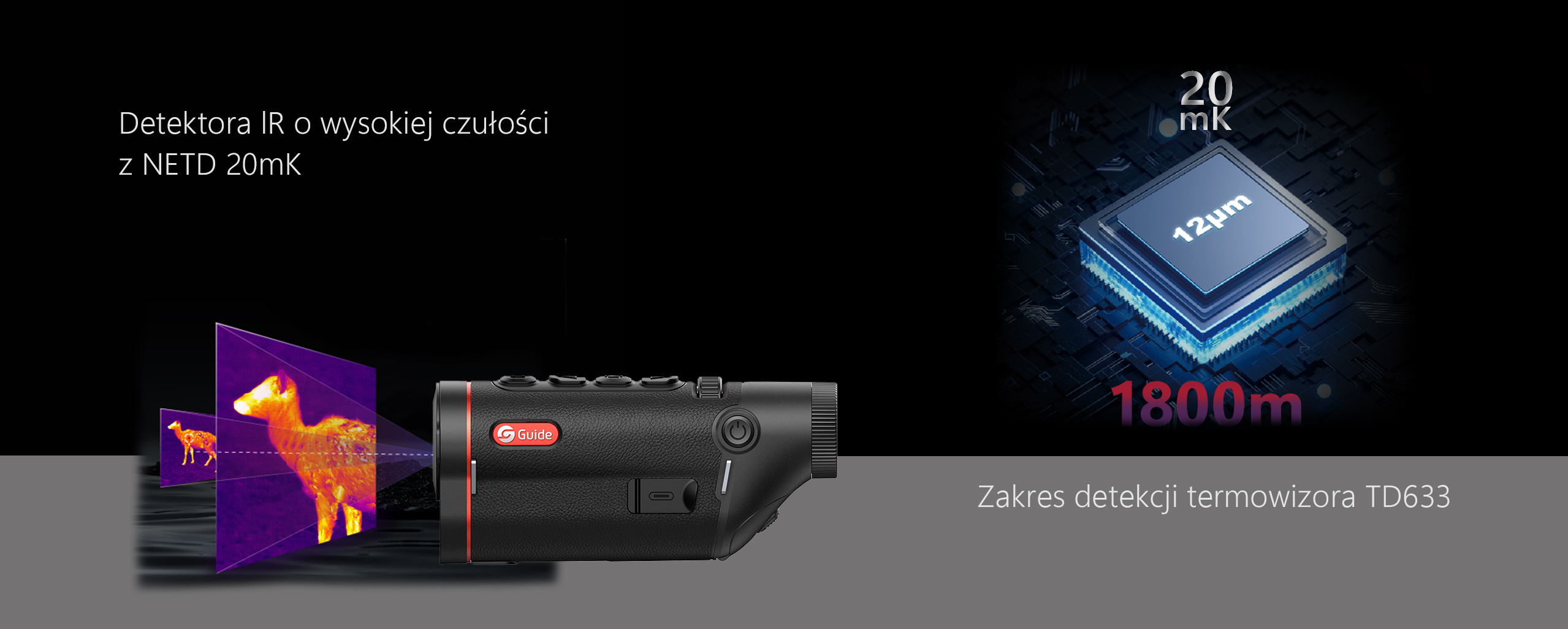 Poziom czułości termicznej w Guide TD jest imponujący, a dostępne tryby czułości sprawiają, że wykrycie obiektu jest dokładne i nawet w przypadku wyższych temperatur otoczenia będziemy w stanie zaobserwować zwierzynę i człowiek.