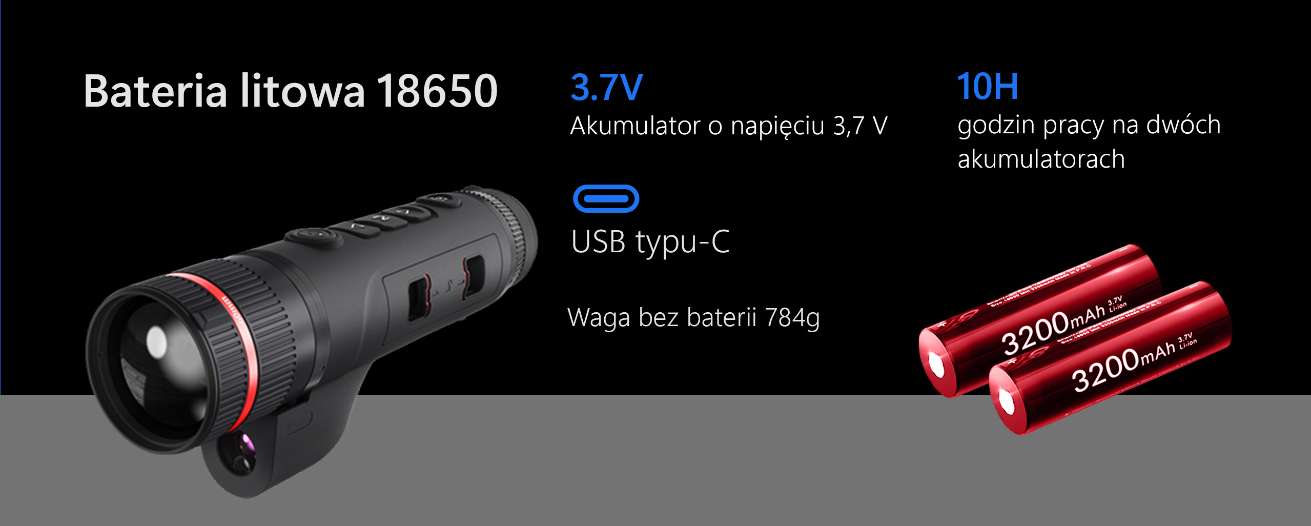 TJ LRF Zoom wykorzystuje do zasilania dwie baterie Li-Ion 18650 zapewniające skuteczne działanie termowizora do 10 godzin. Dzięki możliwości korzystania z zewnętrznego zasilania poprzez port USB Type-C czas działania można dodatkowo przedłużyć.