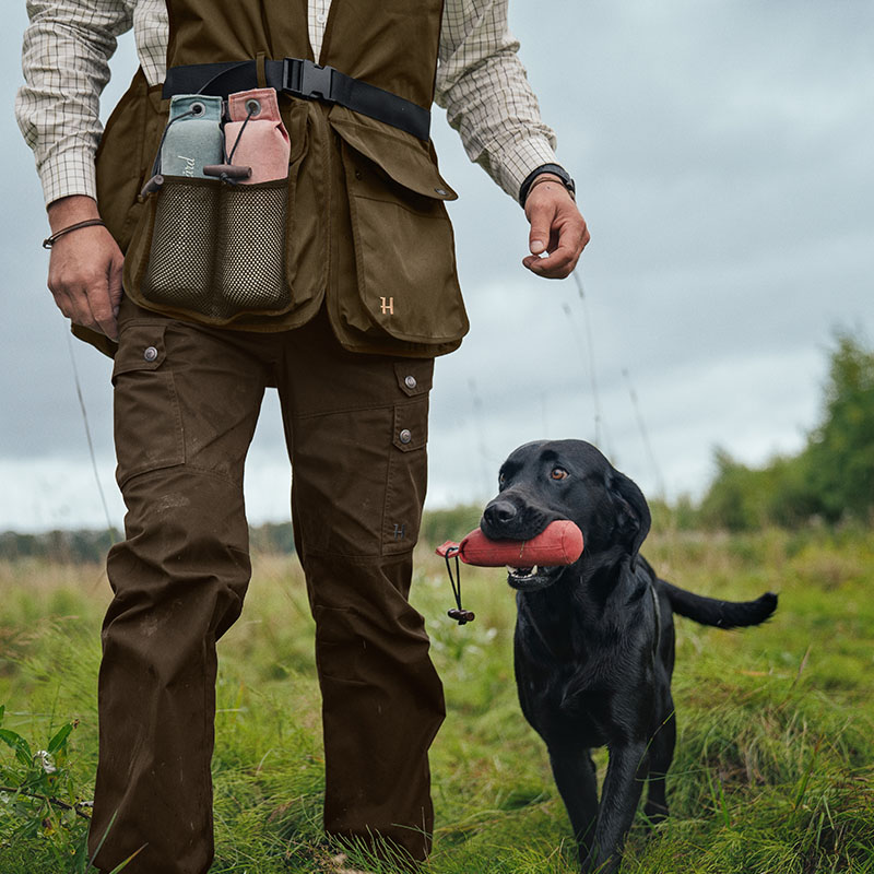 Spodnie Retrieve Light są wykonane z woskowanego płótna z polibawełny, które jest oddychające, wytrzymałe oraz odporne na zabrudzenia i wodę. To sprawia, że są idealne do treningu psów lub strzelania do ptaków łownych, gdzie jesteś w ruchu i potrzebujesz stosunkowo lekkich spodni, które mimo to będą odporne na zużycie. Spodnie posiadają dwie duże kieszenie na udach zapinane na zatrzaski, z których prawa strona dzieli się na dwie mniejsze kieszenie za pomocą wszytego paska z rzepem, co pomaga utrzymać porządek.