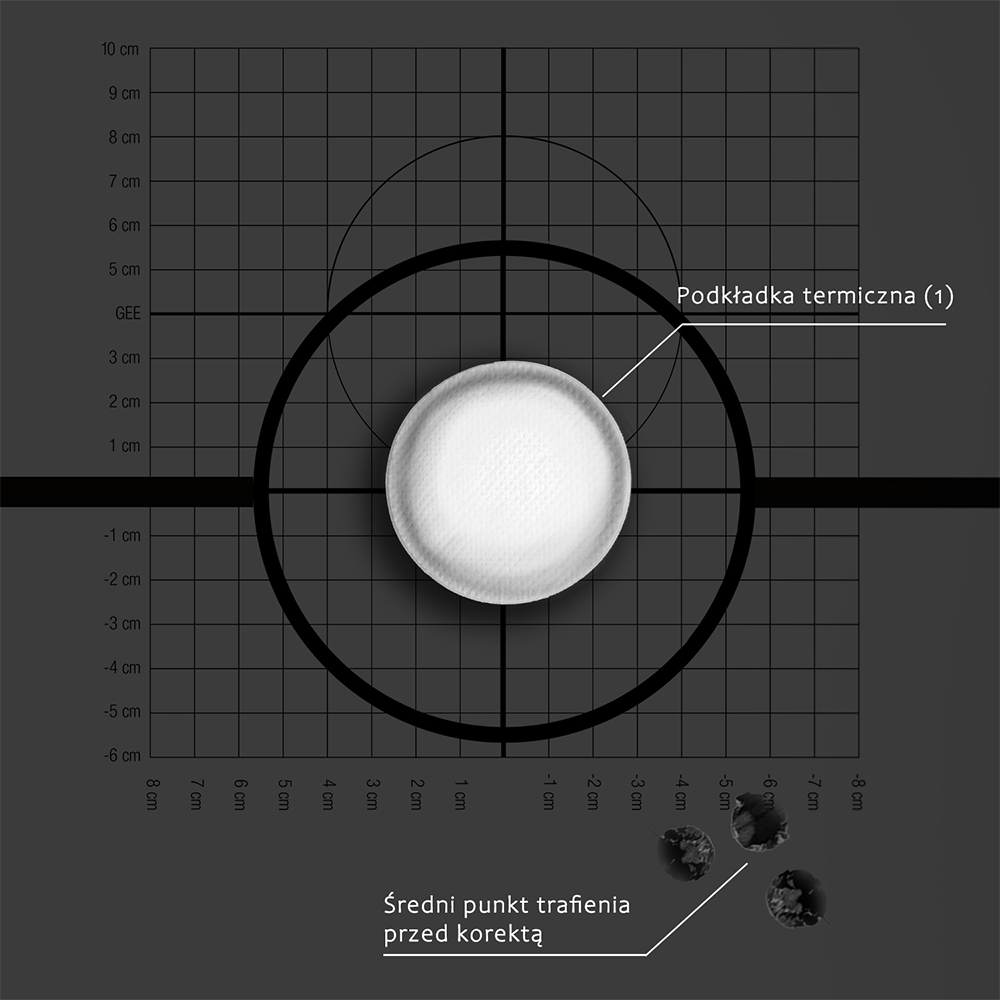 Do korekty punktu trafienia używamy drugiej podkładki termicznej (2) umieszczając ją centralnie na średnim punktem trawienia. Korektę wykonujemy poprzez przeniesienie pozycji krzyża z podkładki (1) na podkładkę termiczną (2).